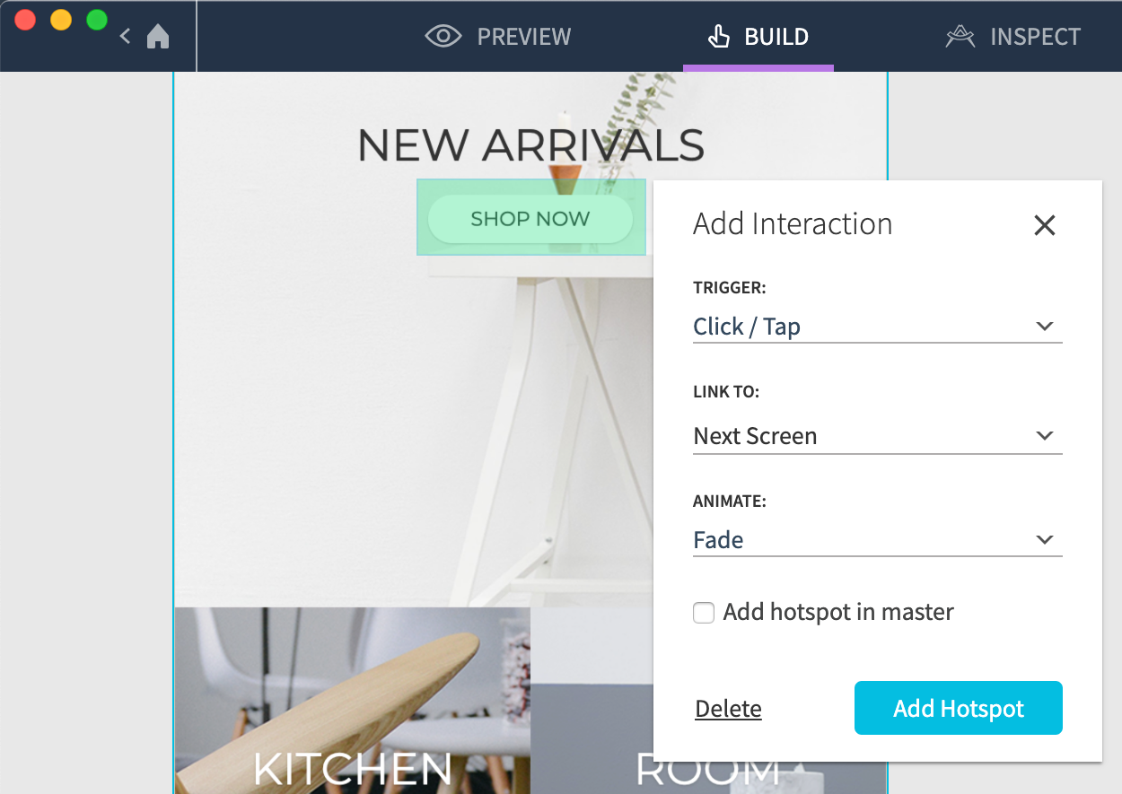 When creating or editing a hotspot, you can check the box for Add hotspot in master to add it to a new or existing master. Hotspot masters are global groups of hotspots that you can add to multiple screens.
