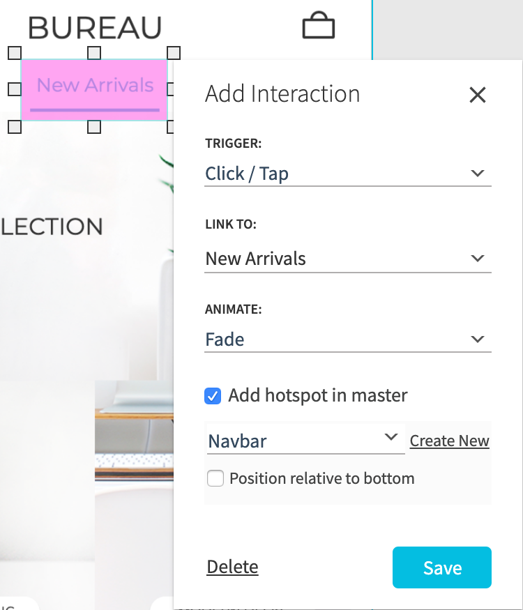 By default, positioning for master hotspots is set relative to the top of the artboard. To instead have it set relative to the bottom of the artboard — for example, when creating footer links — check the box for Position relative to bottom.