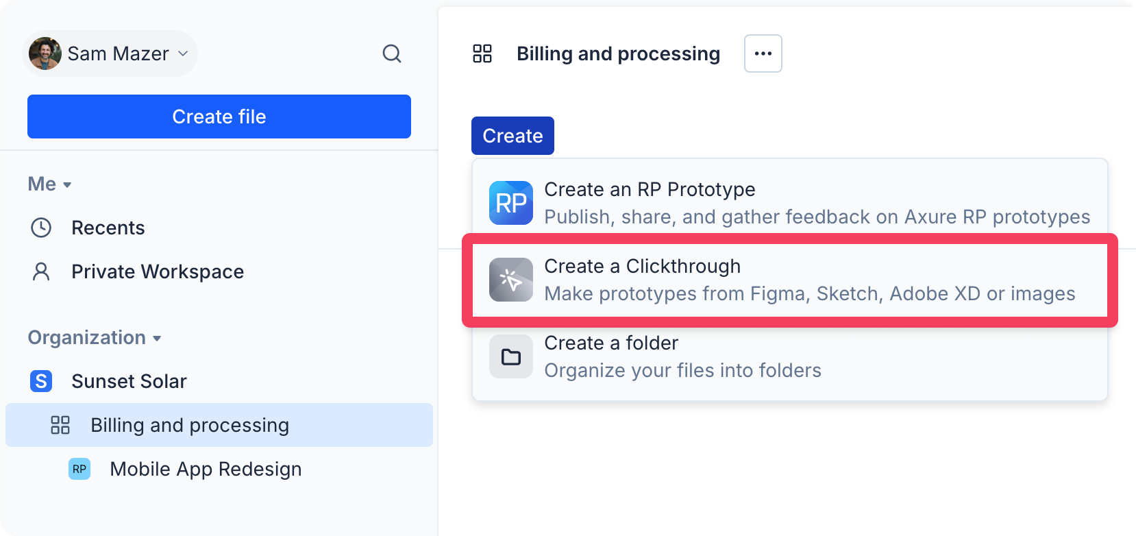 Select the workspace you want to add the new clickthrough project to, and then click Create → Create a Clickthrough at the top-left of the workspace.