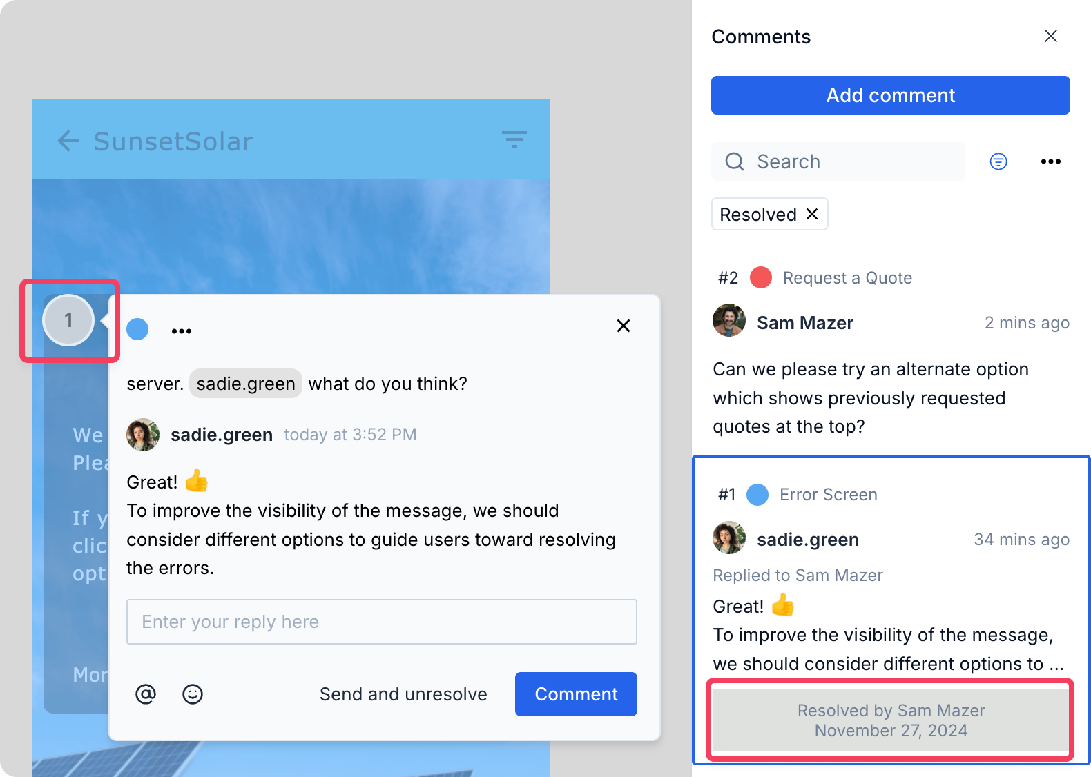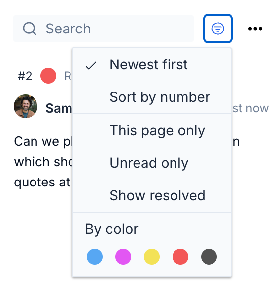 Resolving a comment or thread hides it but does not delete it. You can view resolved comments at any time by clicking the filter button, then selecting Show resolved. This will show the resolved comments in a separate list below the button. Pins for these comments will also be shown, and they will be colored grey to distinguish them from pins for unresolved comments.