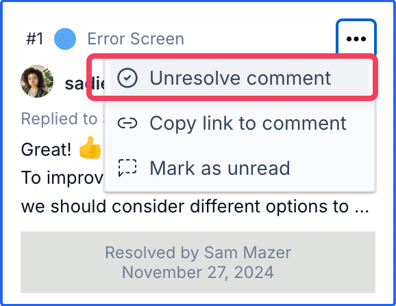 If you need to unresolve a comment, click the More Options button ••• and select Unresolve comment.
