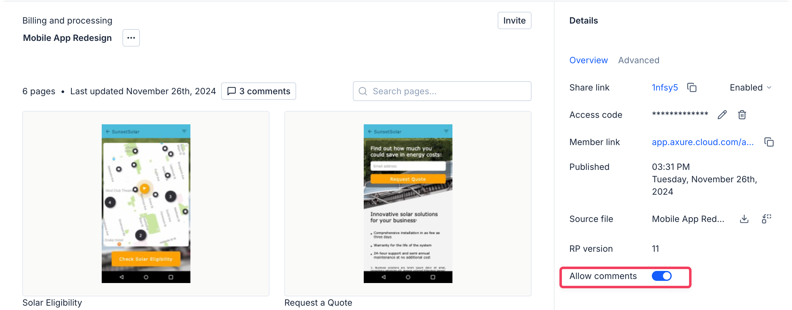 To disable discussions on a project that has already been published — or to enable discussions — click the Allow comments toggle from the details pane of the project's overview in Axure Cloud.