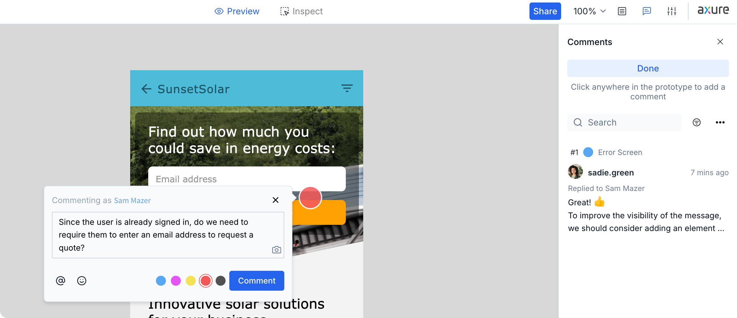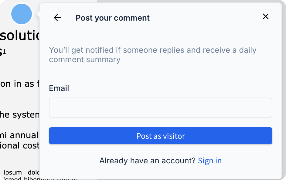 After typing your comment and clicking Comment, you can either sign in to your Axure Cloud account or provide your email address to post as a visitor. If you choose to comment as a visitor, your email address will only be saved for the current browser session.
