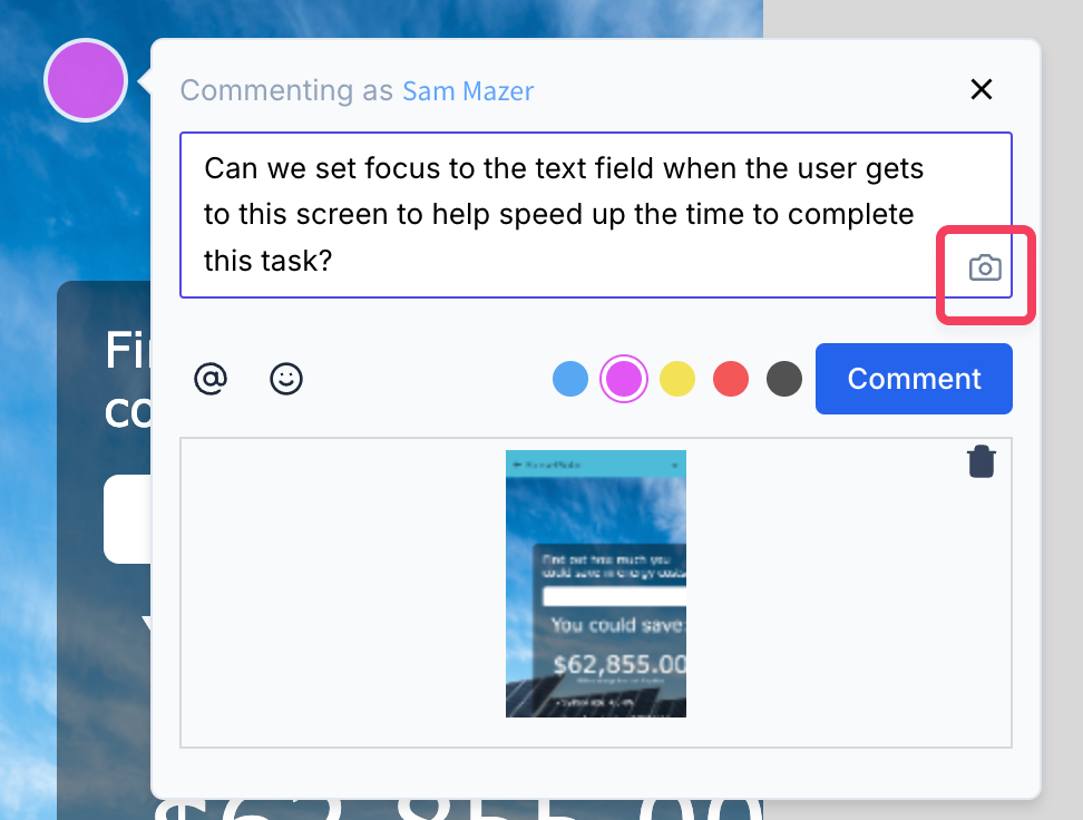 If you're viewing a project in Google Chrome or Microsoft Edge, you can include screenshots in your discussion comments by clicking the camera icon at the bottom-right of the comment box. Click-and-drag on the page to define the area you want to capture, and then release your mouse to save the image.