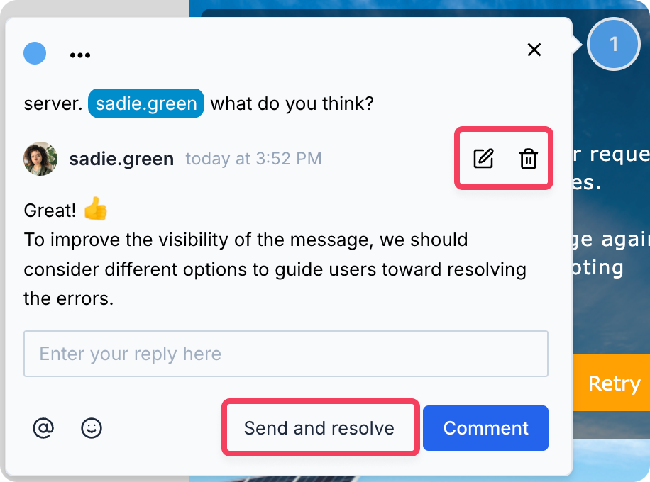 Use the options in a discussion box to edit a comment's text and screenshots, change the thread's pin color, delete a comment, or mark the thread as resolved.