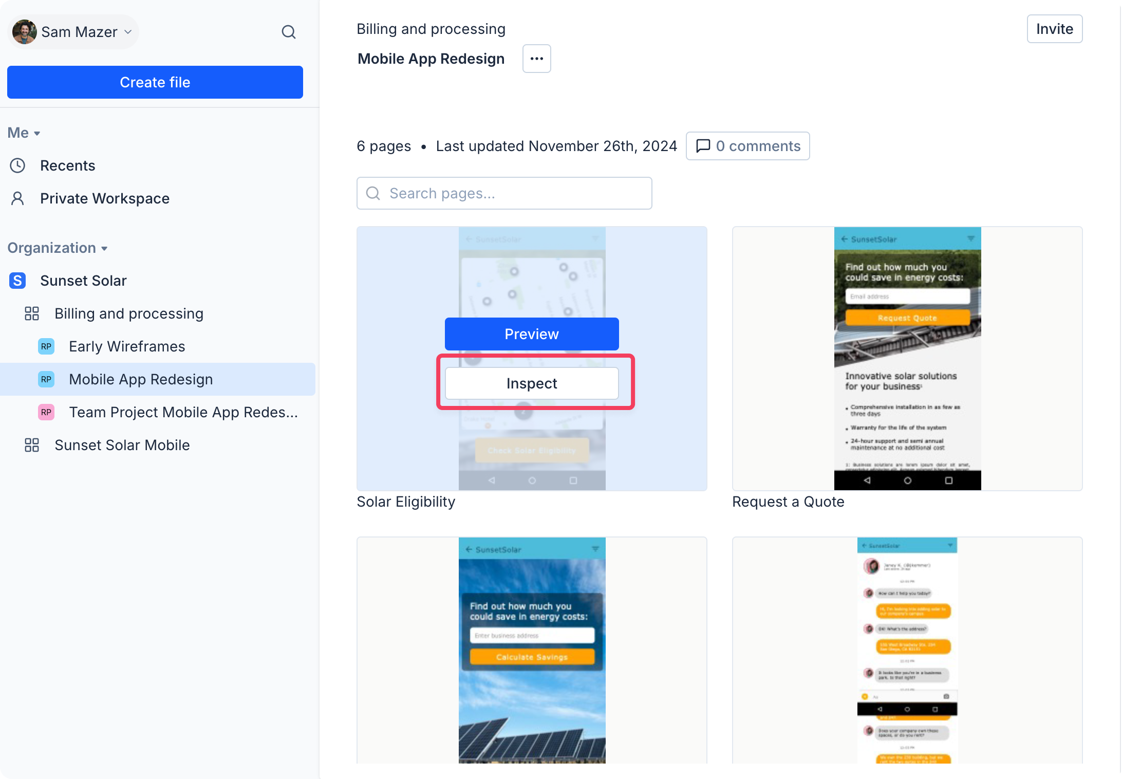 To get started, log in to app.axure.cloud or the Axure Cloud desktop app and click on a project's name. On the project's Overview screen, hover over the thumbnail of a page or artboard you want to work with and click Inspect.