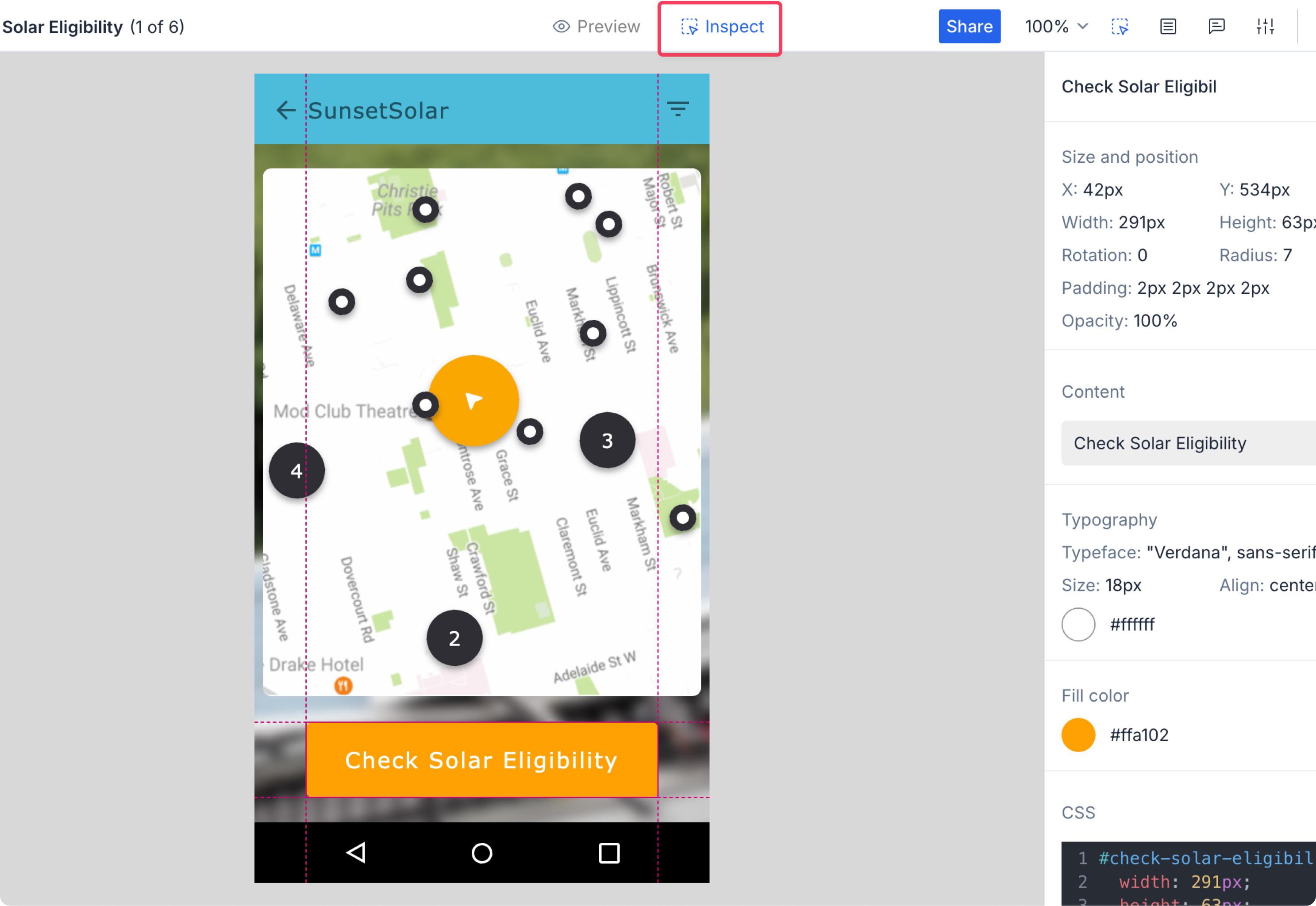 When working with a project inside its workspace on Axure Cloud, you can click Inspect on a page's thumbnail or in the prototype player to view style, content, and layout information about the elements on the page.