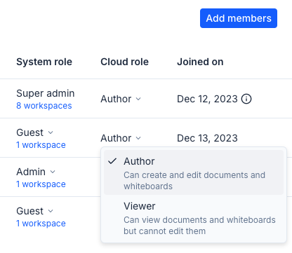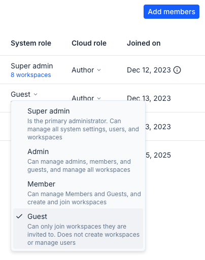 Assign their System role and Cloud role from the dropdown, and then click Add members.