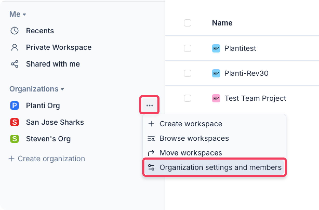 Click the Options button ••• to the right of the organization in the left-side panel.