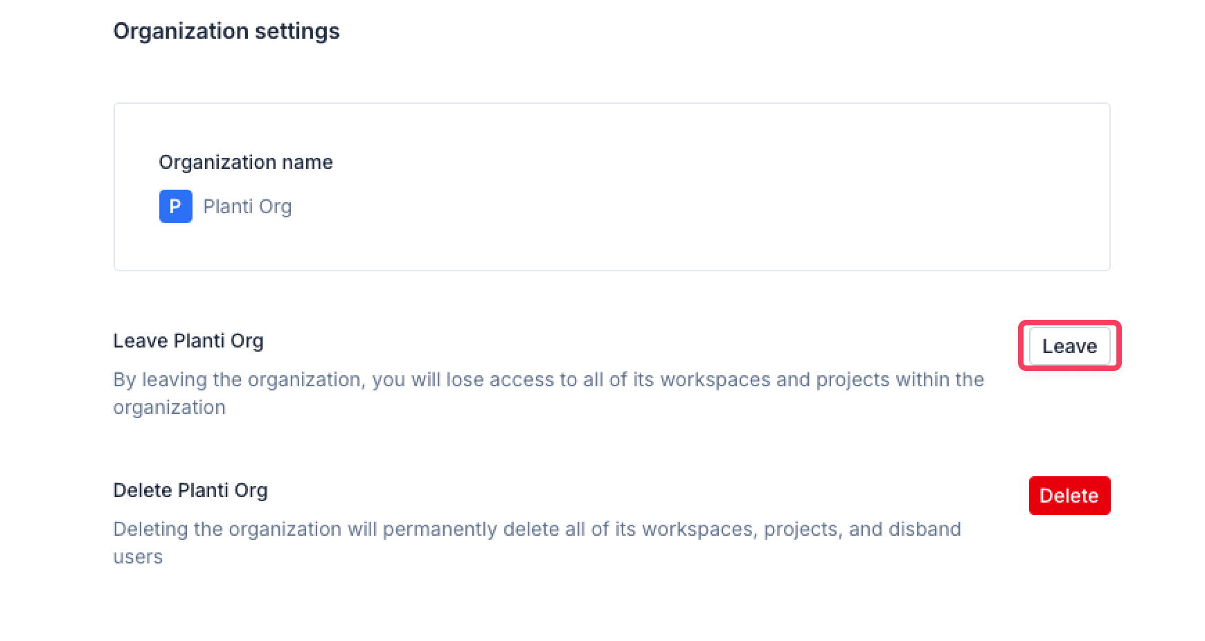 If you no longer need to be a member of an organization and access any of its workspaces and projects, you can leave an organization.