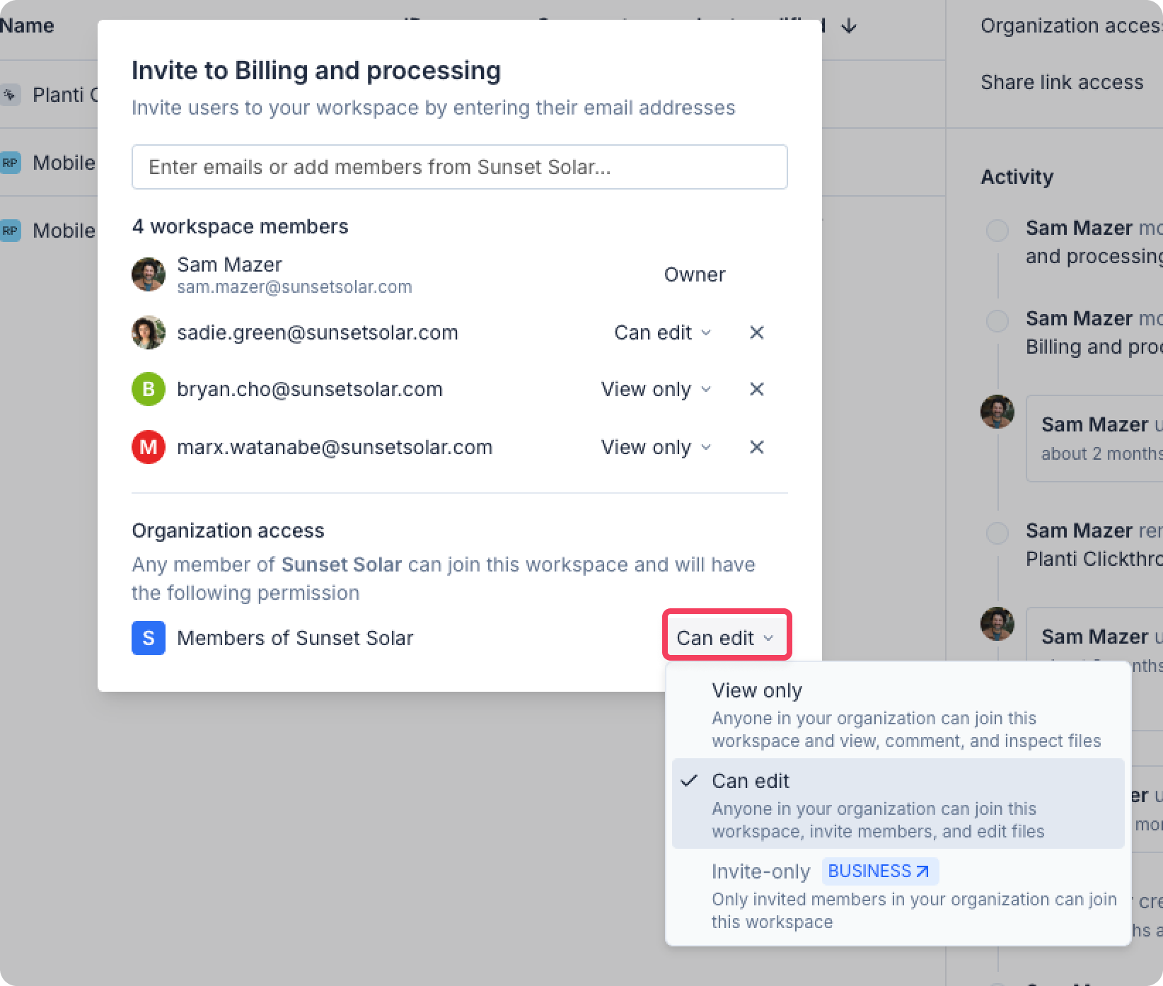 In the Organization access section of the dialog, select View only or Can edit from the dropdown.