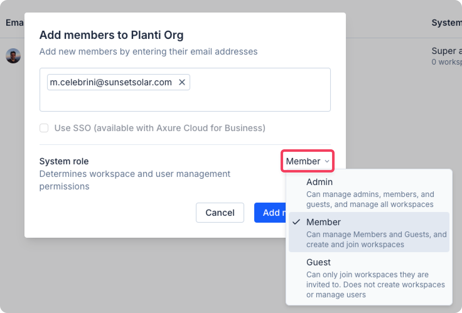 When you invite users to join your organization, you can determine what level of access they have when you assign their system role. There are four system roles: Guest, Member, Admin, and Super Admin.