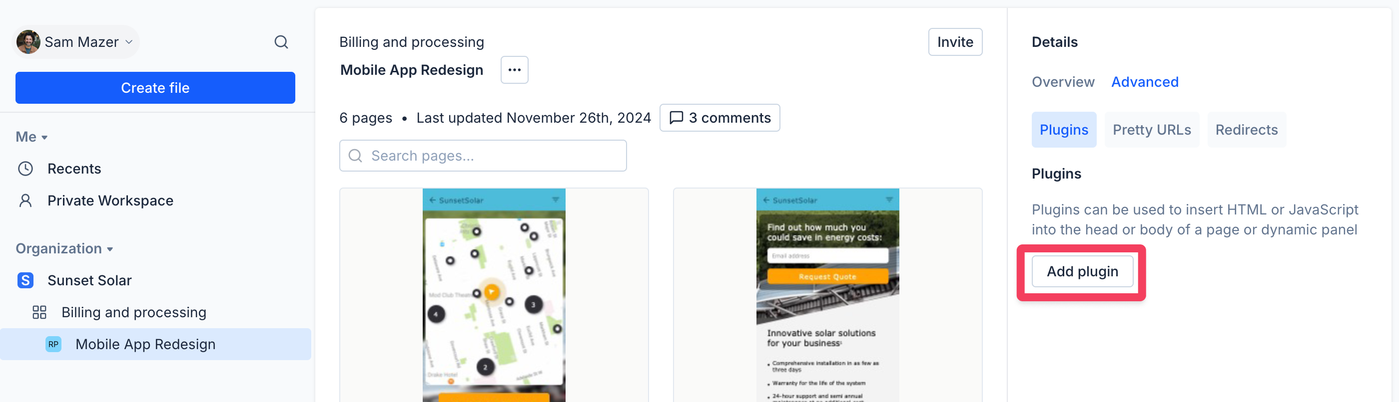 You can use Axure Cloud plugins to add custom HTML, CSS, and JavaScript to your Axure Cloud–hosted RP projects. Use plugins to add things like analytics, social media buttons, or your own hand-written code to your projects.