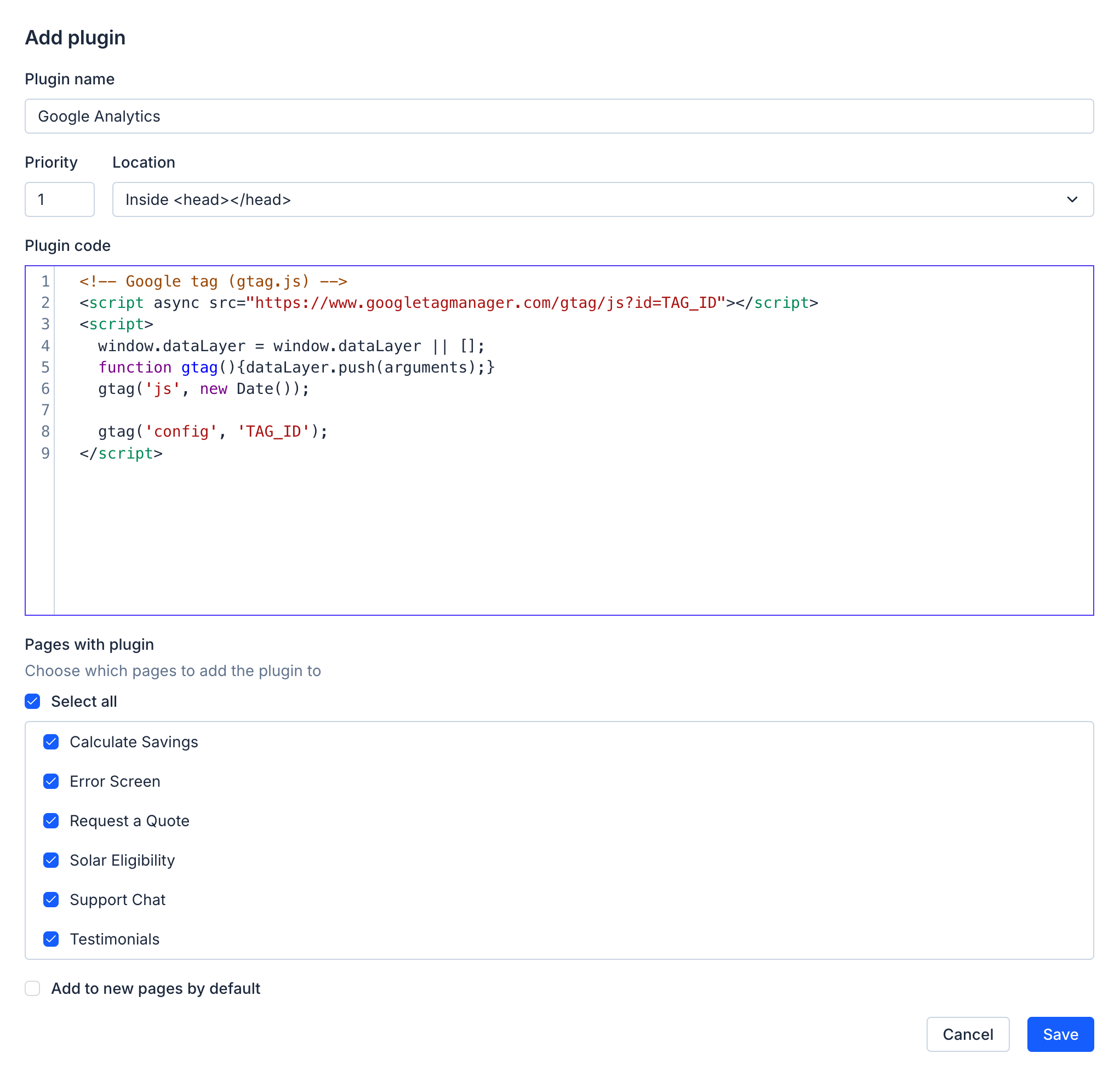 tipIf you would like the plugin to be added to all pages in the project, make sure to check Add to new pages by default before you save the plugin. This will automatically add the plugin to any additional pages you create in the project's RP file later.