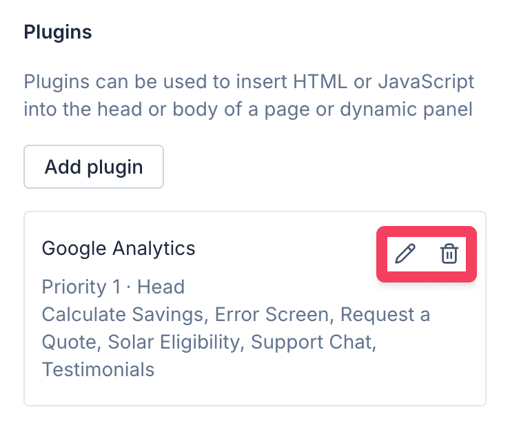 To edit a plugin's name, location, loading priority, or code, click the Edit button ✏️ of the plugin.