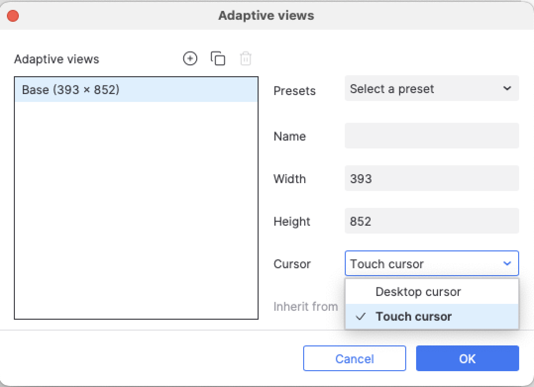 A mobile touch cursor will be used by default for any adaptive view with a defined height. You can override this with a desktop cursor in the Cursor dropdown.