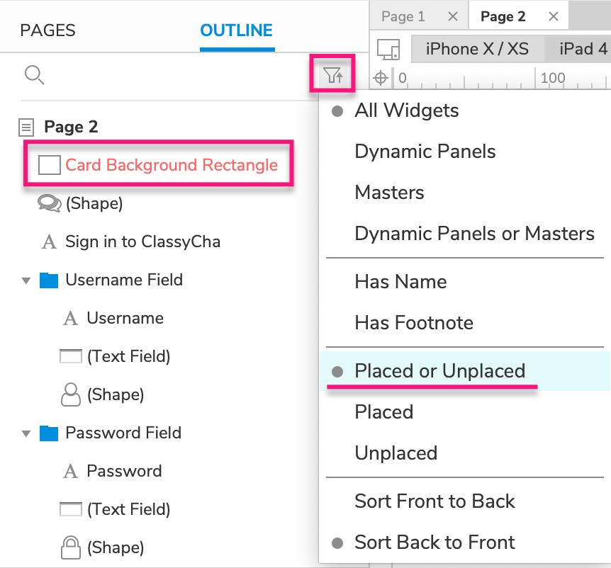 To ensure that you see both placed and unplaced widgets in the Outline pane, click the Sort and Filter icon at the top-right of the pane and select Placed or Unplaced.