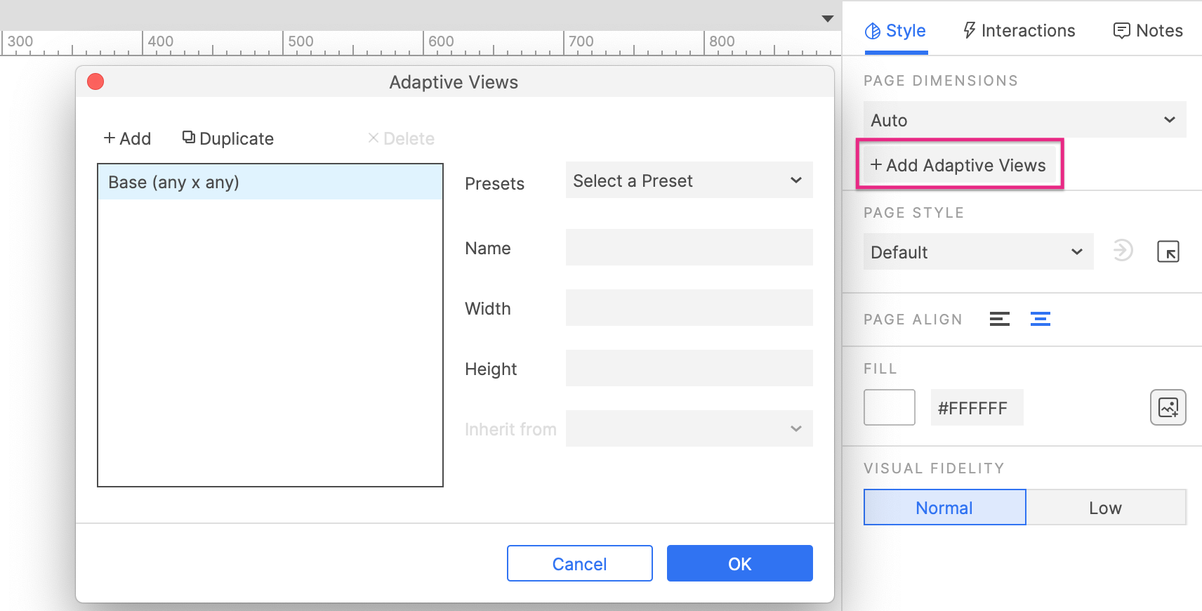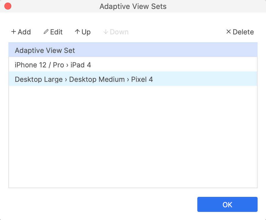 Adaptive views are organized into sets, and you can have multiple sets in a project. To create new adaptive view sets or edit your existing ones, click Add/Edit Adaptive Views at the top of the Style pane (with a page focused), or use the Project → Adaptive View Sets menu option.
