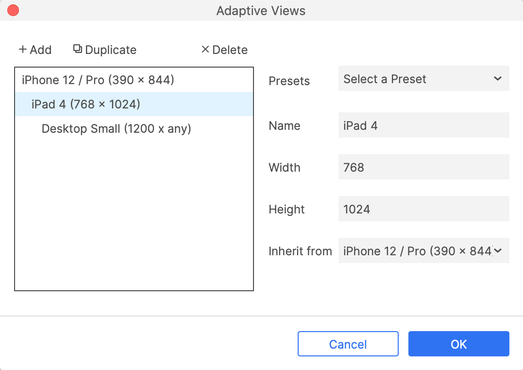 To add a new adaptive view to a set, click Add at the top-left of the Adaptive views dialog, and then configure the view with the fields on the right. You can define your own custom page dimensions or select from a number of popular device dimensions in the Presets dropdown.