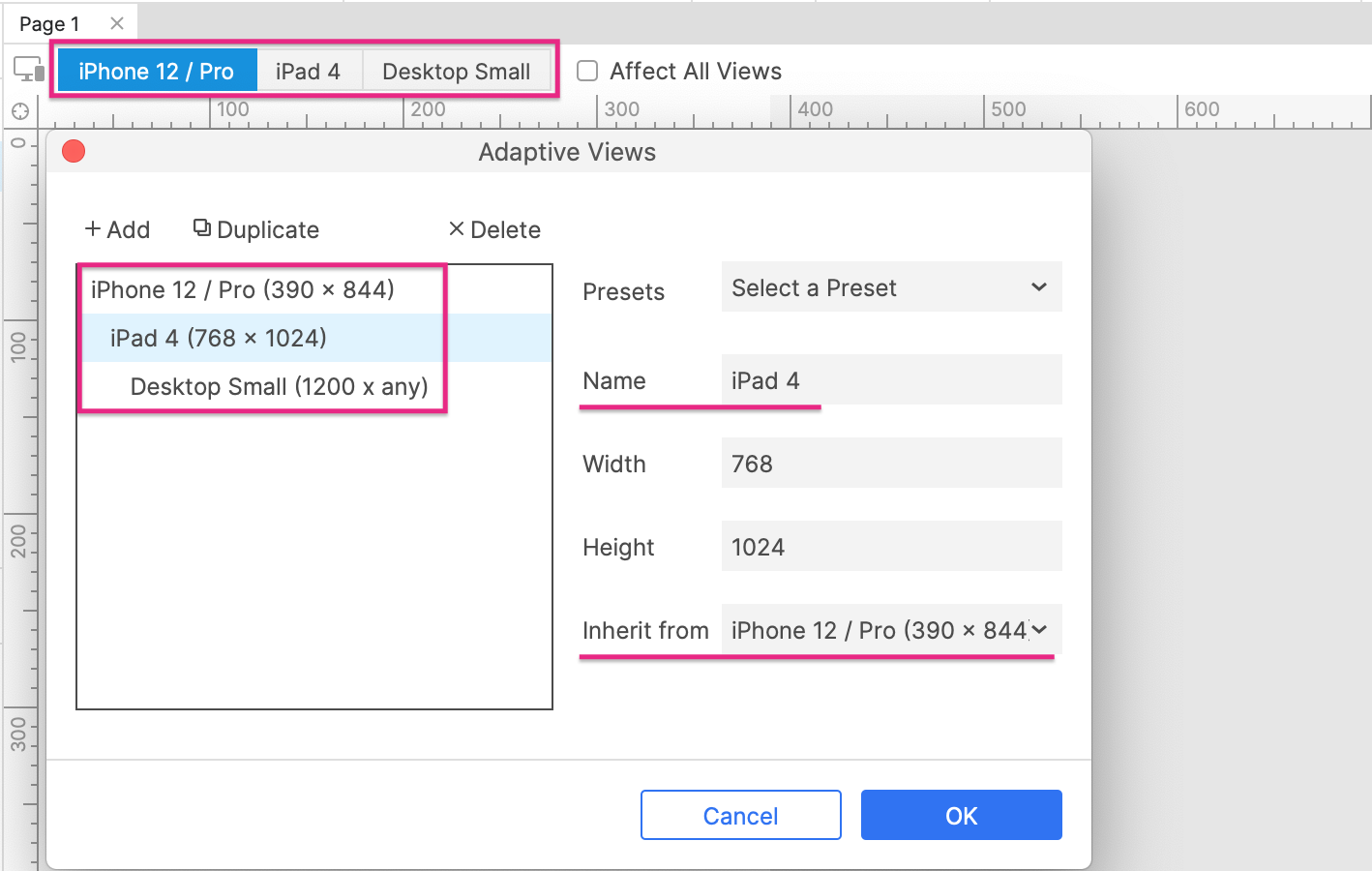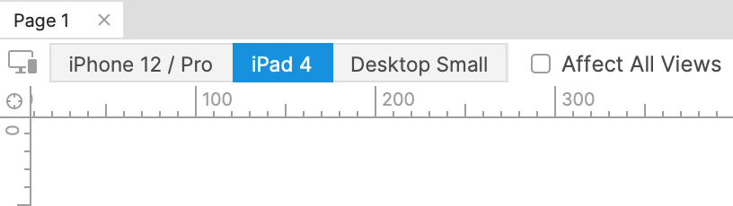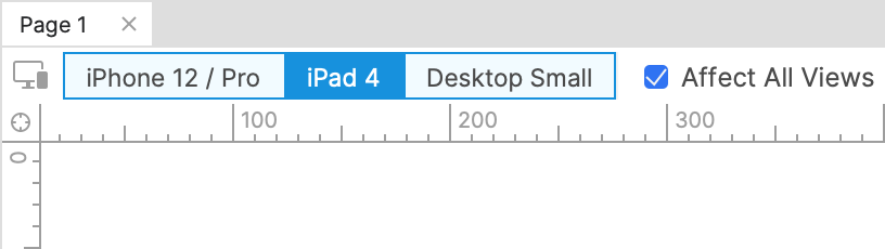 Once you've added a set of adaptive views to a page, you can access each view by clicking its name at the top of the canvas. The color of a view's name indicates whether it will be affected by edits you make on the canvas:
