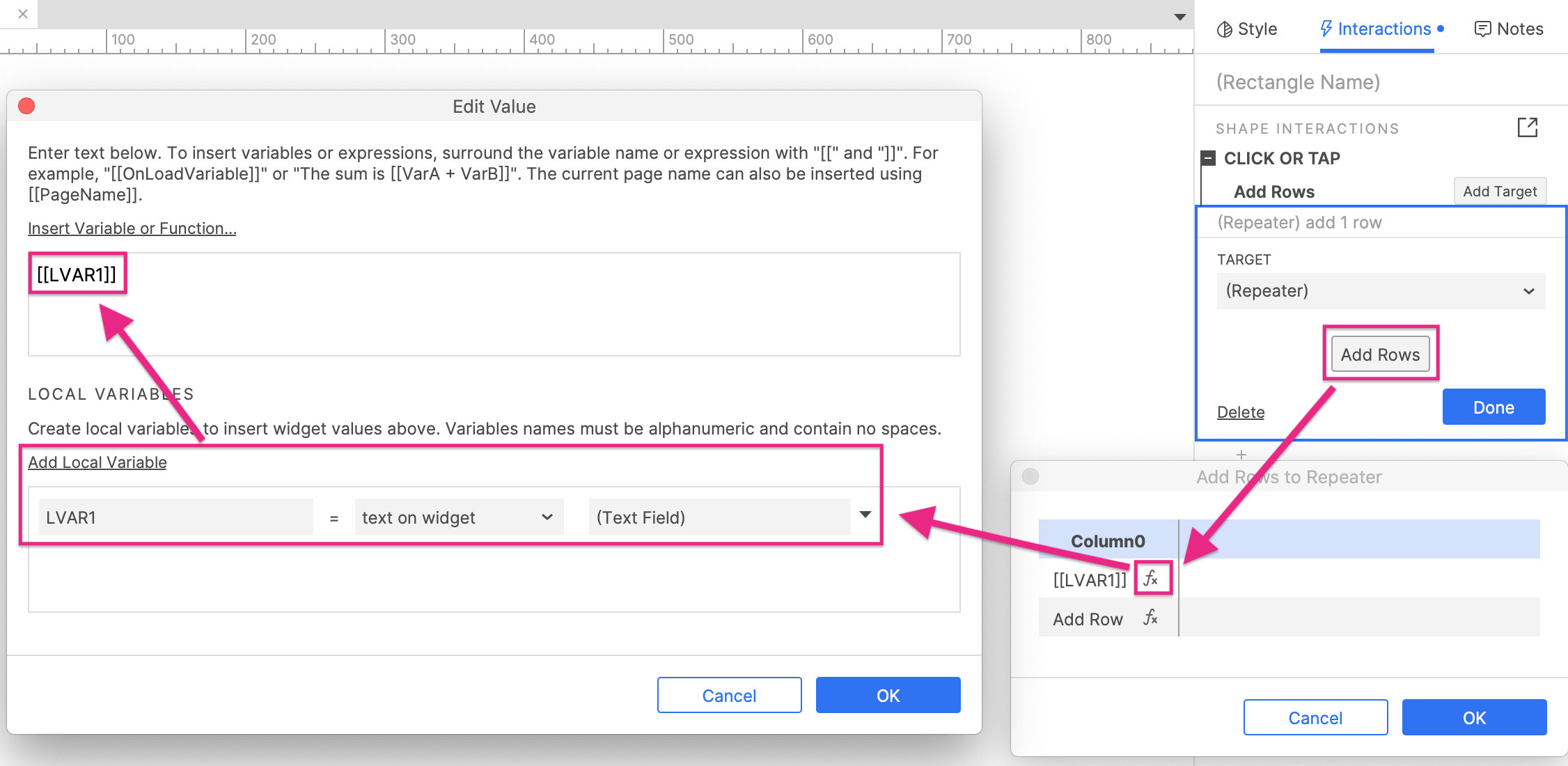 Click the Add rows button. In the Add rows to repeater dialog that appears, click the fx icon to open the Edit value dialog.