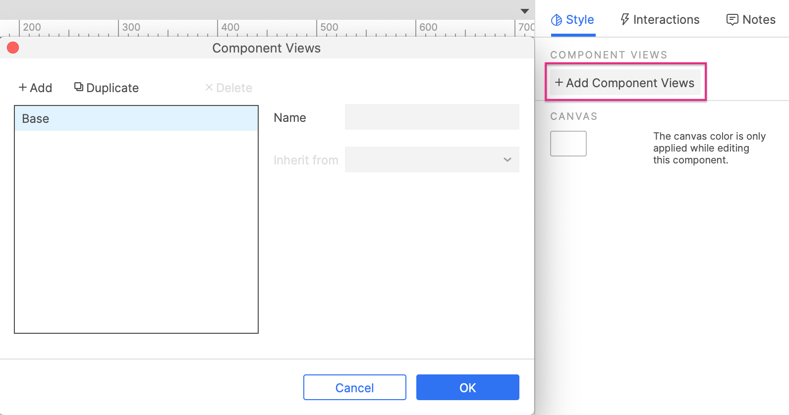 To add component views to a component, start by opening the main component on the canvas for editing. Click the canvas to focus the component itself, and then click Add component views in the Style pane to open the Component views dialog, where you'll create and manage your views.