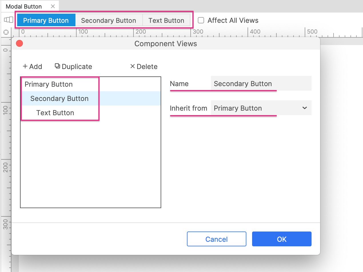 Once you've added component views to a component, you can access each view by clicking its name at the top of the canvas. The color of a view's name indicates whether or not it will be affected by edits you make on the canvas: