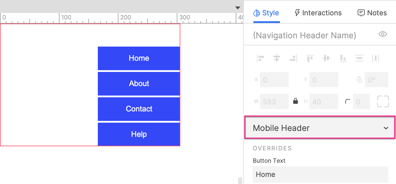 Furthermore, if you edit a widget property in a child view, edits to the same property in a parent view will no longer affect the child view. For example, if you change a button's fill color to pink in a child view and then change that same button's fill color to green in the parent view, the button will still be pink in the child view, not green.