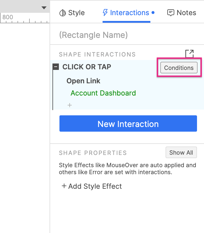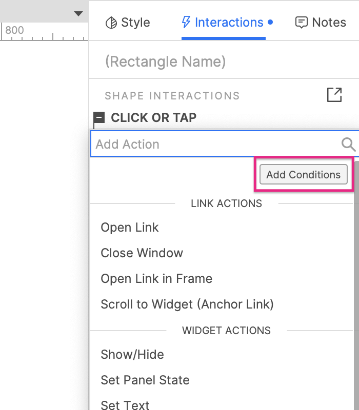 To add conditional logic to an interaction, hover over the event name and click Conditions. Alternatively, select Add conditions at the top of the Actions list when building an interaction.