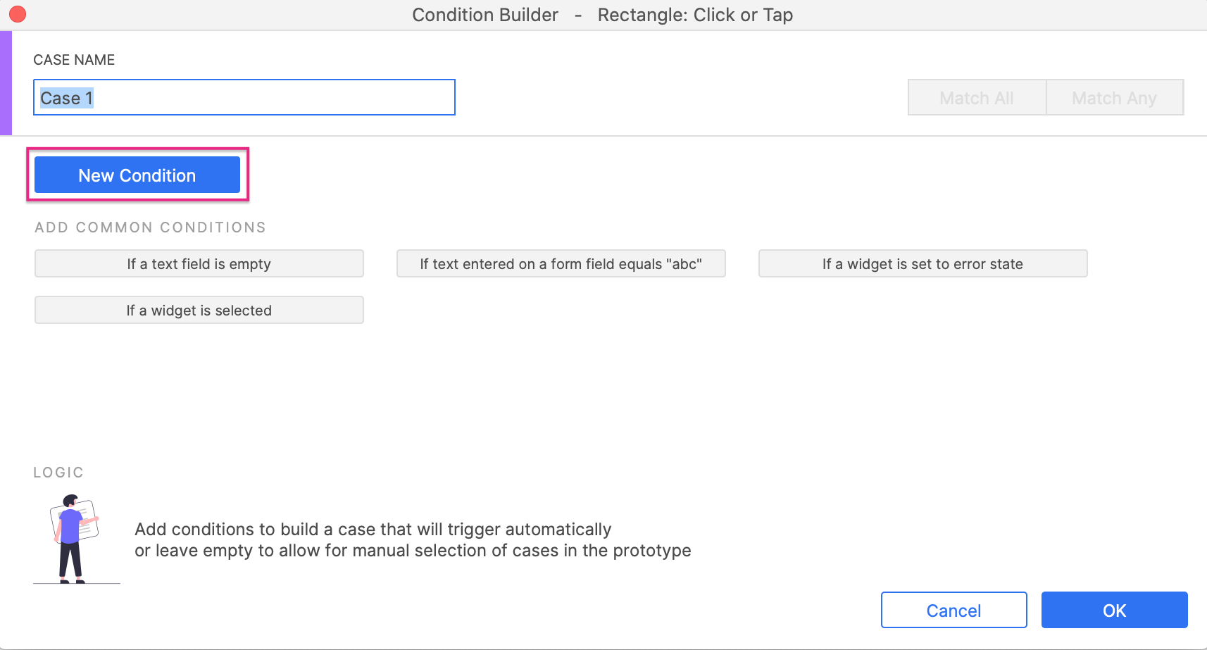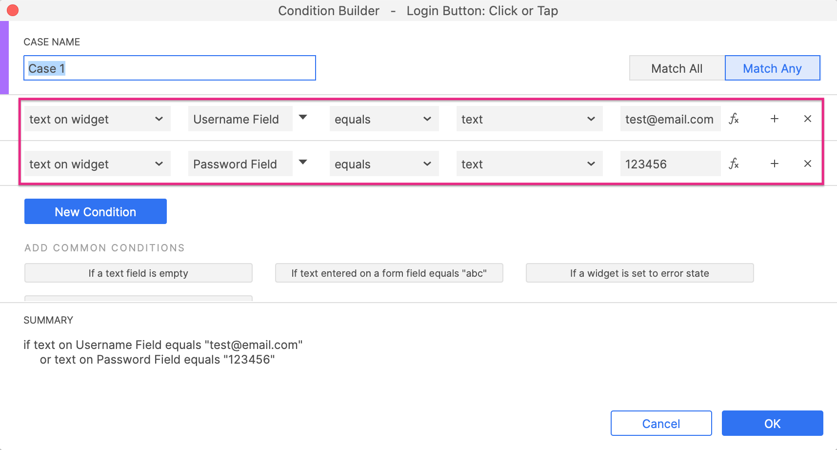 When adding conditional logic to interactions for certain widgets (such as text fields, buttons, and other shape widgets), you have the option of choosing from common conditions that are available in the Condition builder dialog.