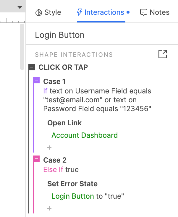 If, however, one of the two fields doesn't contain the correct value when the button is clicked, the first condition will evaluate to false and its case will not be executed. The prototype will then move on to the second case and evaluate its condition. The second case has no condition, so it gets executed by default, and the error message is displayed.