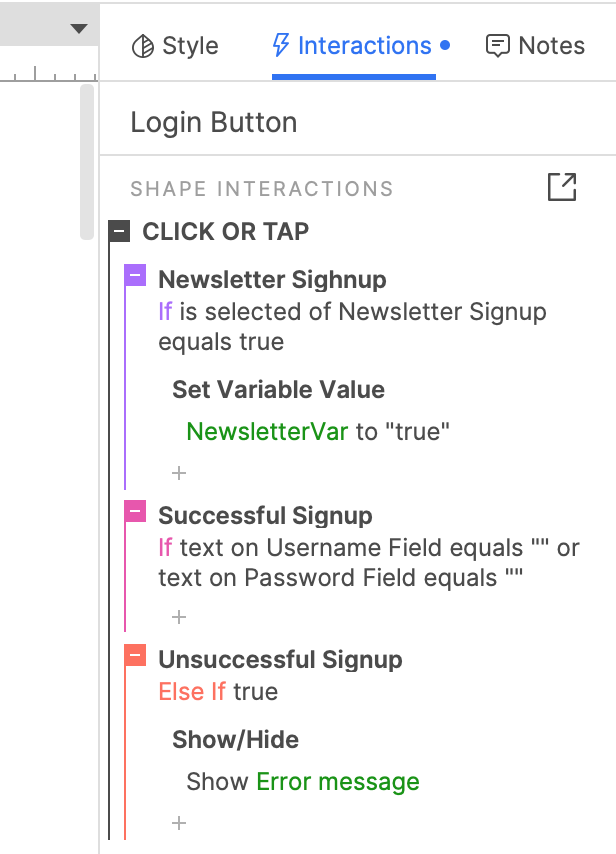 For example, the submit button for a signup form might have two IF / ELSE chains under its Click or tap event, one that determines whether the user has opted to sign up for a newsletter and a second determines whether the user has filled in all required fields.