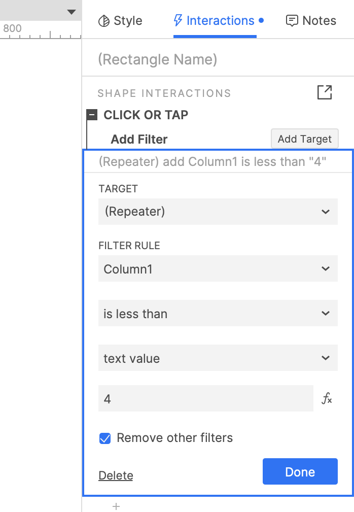 Select the "Add Filter" button widget and click New interaction in the Interactions pane.