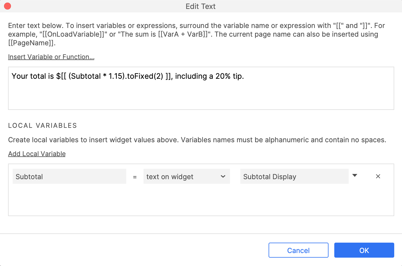 From there, you can click Insert variable or function to view the full list of variables and functions available for use in expressions. You can also create local variables to access specific widget properties in your expressions.