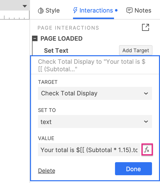Expressions allow you to dynamically generate text and numeric values through interactions in your prototypes. You can use expressions to do things like calculate the purchase total for a shopping cart, dynamically construct UI messages, and display the current date.
