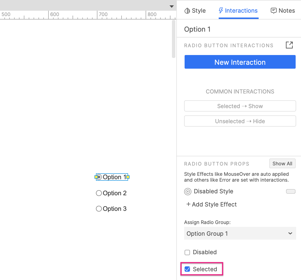 You can also dynamically select a radio button with the Set selected/checked action. The true option will select the radio button, and the false option will deselect it. The toggle option will set the radio button to the opposite of the state it's in when the interaction occurs.