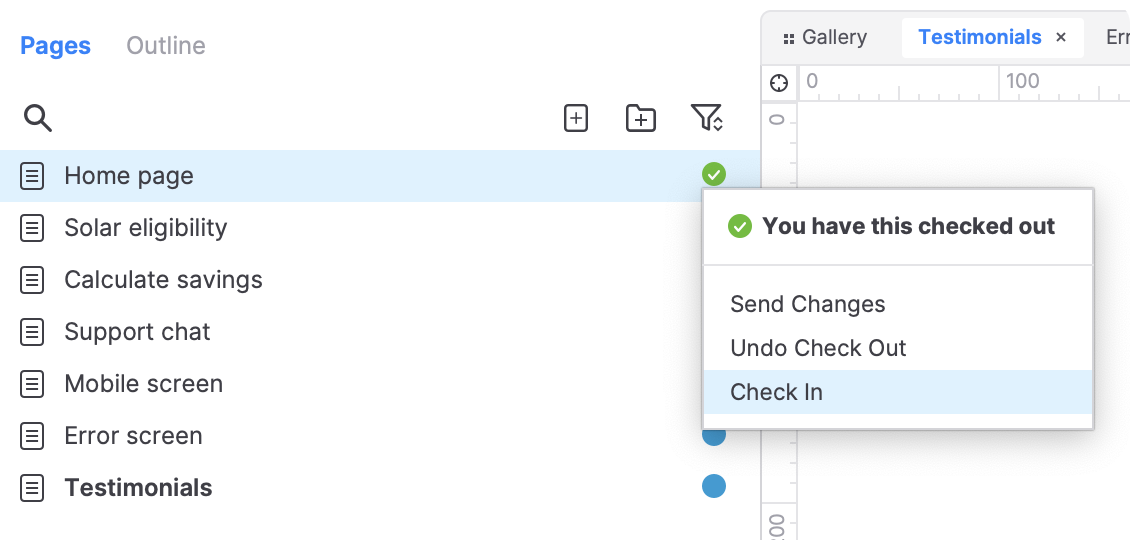 To check in a page or component, right-click it in the Pages or Components pane and choose Check in. You can also access this this menu option by clicking the page or component's status icon.