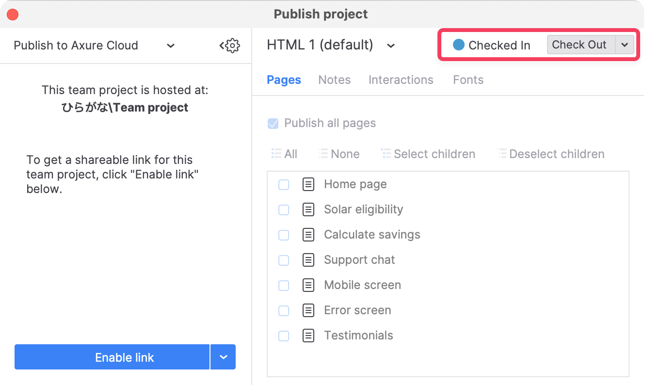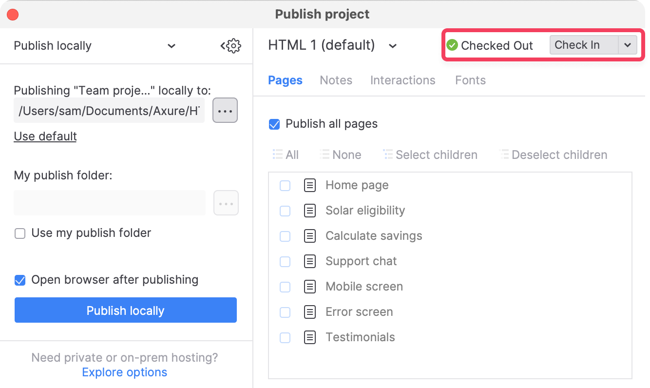 You can also use the Team → Check out everything menu command to check out all of the pages, components, and generators in the team project.