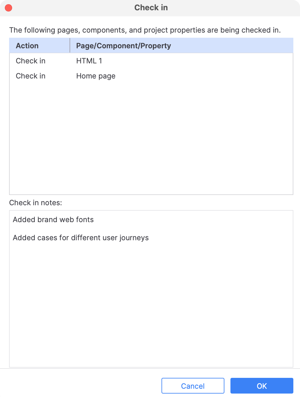 The Check in dialog will open. At the top of the dialog you'll see a list of all the project items (pages, etc.) being checked in. At the bottom, write your check-in notes.