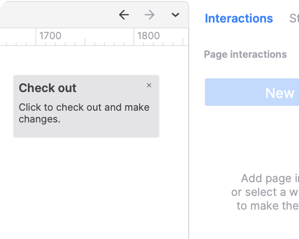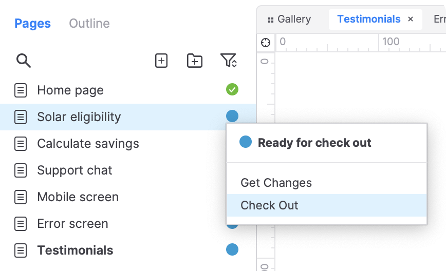Another way to check out a page or component is to first open it on the canvas and then click the Check out button that appears at the top-right corner of the canvas when you hover over the canvas.