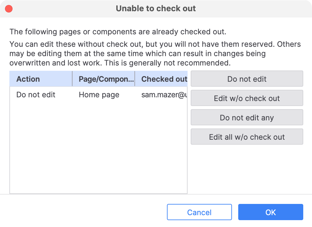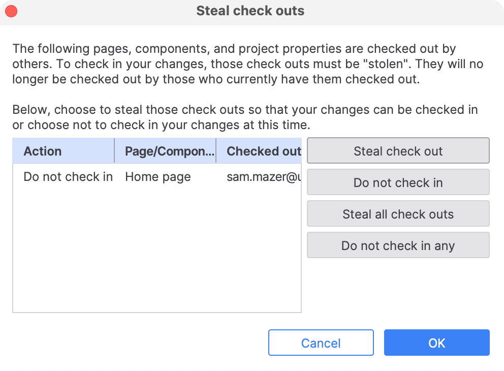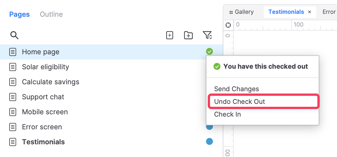 To cancel all changes you've made to a page or component since you checked it out, right-click its name in the Pages or Components pane and click Undo check out.