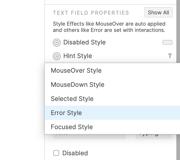 - Select the Email Field text field, head over to the Interactions pane, then click Add style effect under the Text field properties section, and then select Error style from the dropdown. Set the Line color to red.
