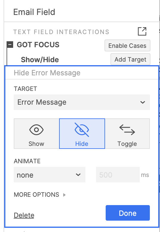 - In the Interactions pane, click the Insert action icon below the new case heading. Select Show/hide in the list that appears, and target the Error message widget. Leave Show selected and click OK.