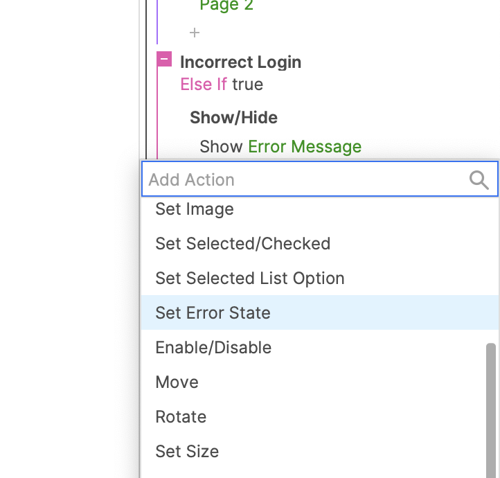 With the Login Button selected, hover over the + icon under the Incorrect Login case, and click Add action.