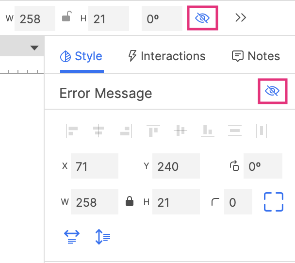 - Change the error message's font color to red, and hide it by clicking the Hidden icon in the style toolbar or the Style pane.