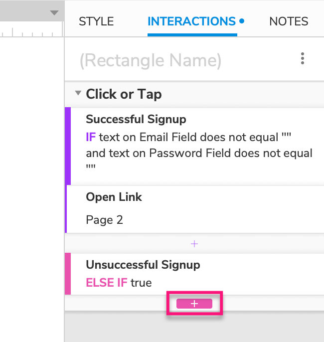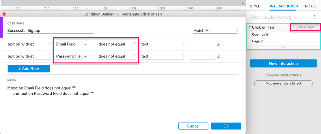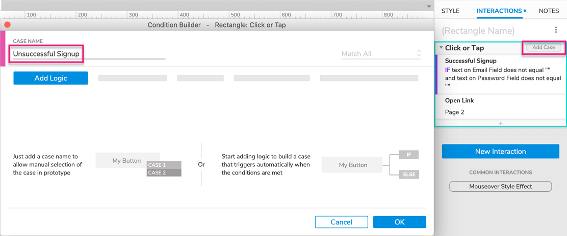 With the signup button selected, hover over the Click or tap heading in the Interactions pane and click Add Case to the right.