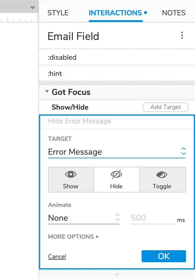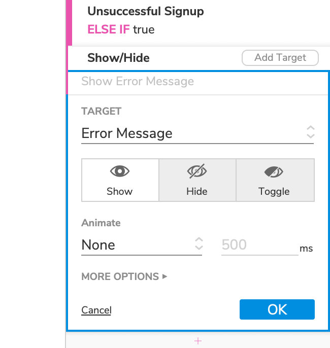 Select Show/Hide in the list that appears, and target the Error Message widget. Leave Show selected and click OK.