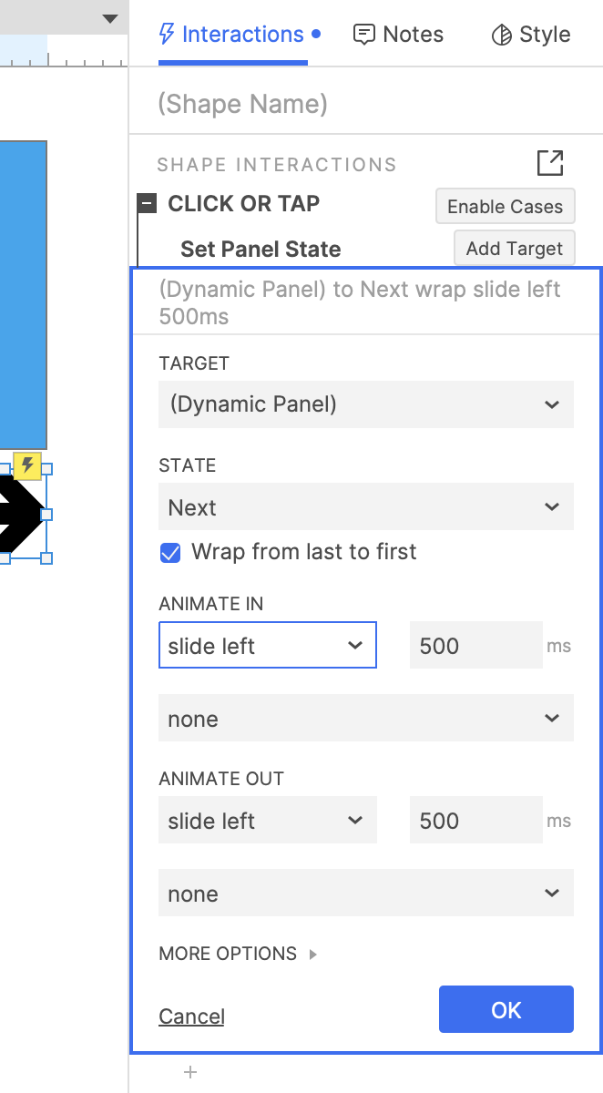 Repeat Step 4 with a left-facing arrow. Set the dynamic panel's state to Previous instead of Next, and choose Slide Right for the Animate In animation.