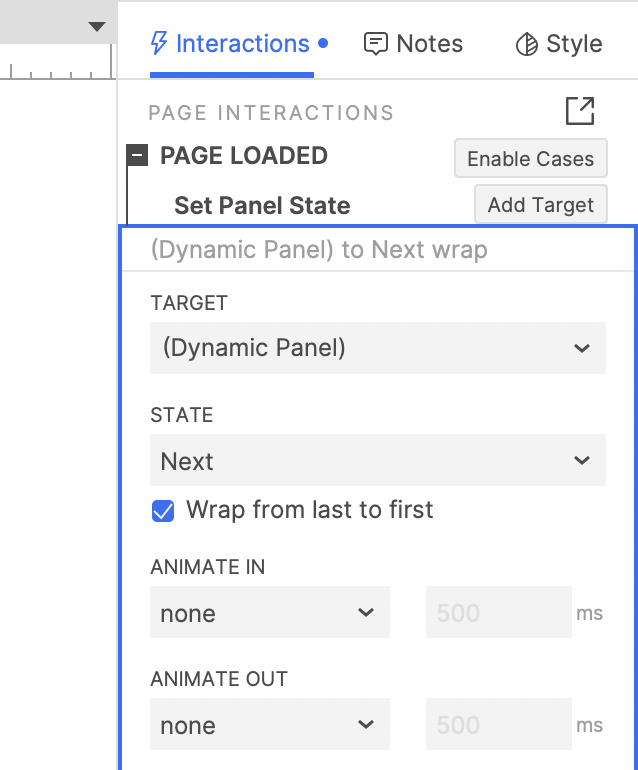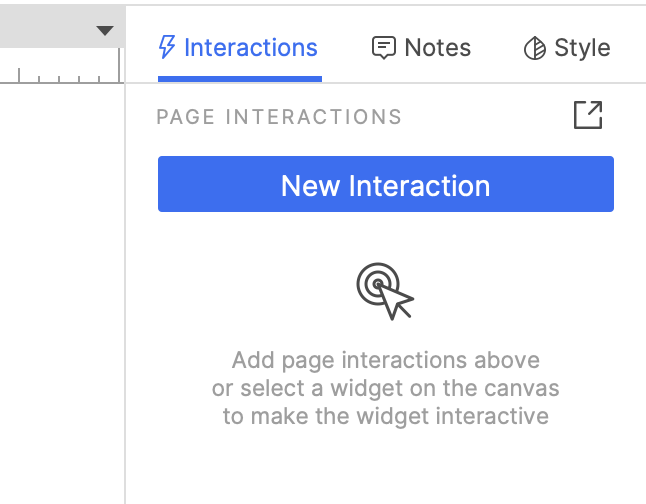 - Click a blank spot on the canvas to select the page itself, and then click New Interaction in the Interactions pane.