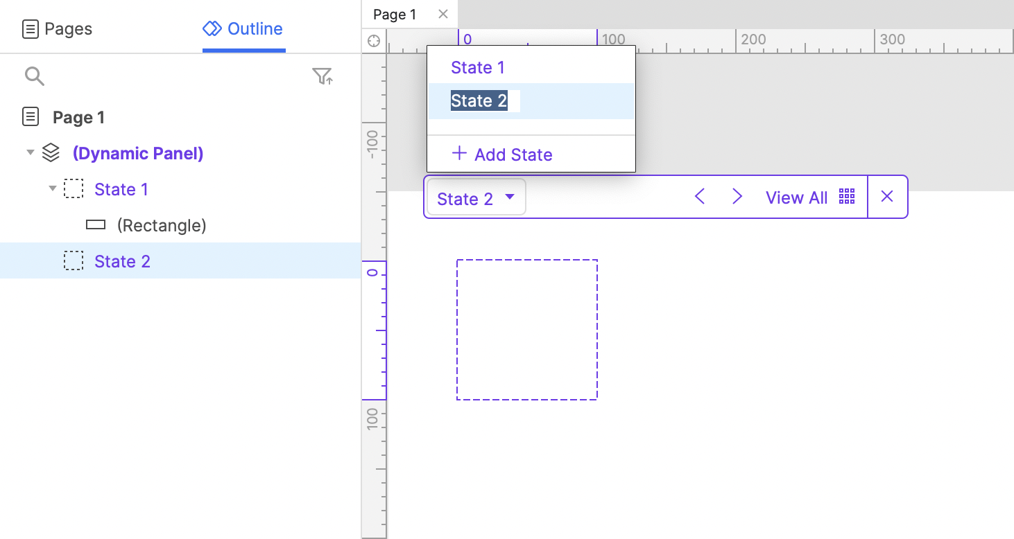 In the floating toolbar above the dynamic panel, click State 1. At the bottom of the dropdown that appears, click Add State to create State 2.